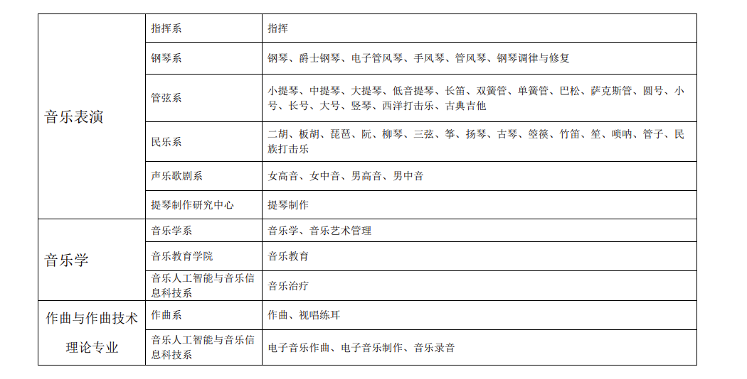 迄今,“音乐与舞蹈学”学科下设的作曲与作曲技术理论、音乐学、音乐表演三个大的专业类别,共涵盖50余个本科专业方向、70余个硕士专业方向、40余个博士研究方向,这使学校成为国内专业设置最齐全的一所音乐学院。