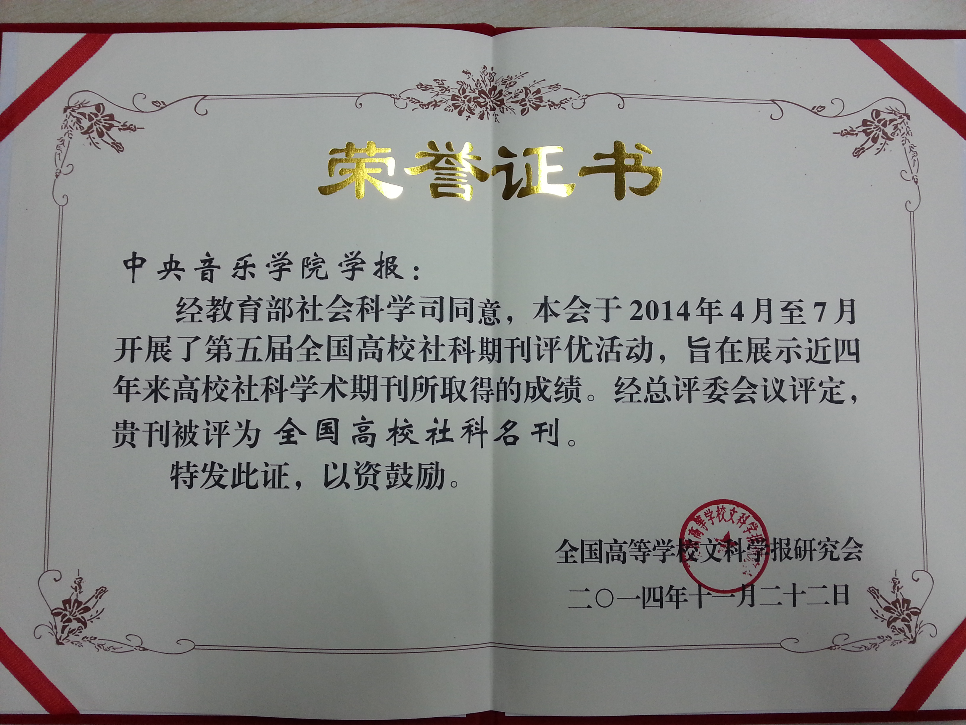 全国高等学校文科学报研究会于2014年6—7月开展了第五届评优活动,并于近期进行了颁奖。共评出全国高校社科名刊31种、全国高校精品社科期刊79种、全国高校百强社科期刊107种、全国高校优秀社科期刊255种、全国高校社科期刊特别贡献奖1种、全国高校社科期刊特色栏目216个。同时在各会员单位自愿申报的基础上,评出全国高校社科期刊优秀编辑224名、全国高校社科期刊优秀主编154名、全国高校社科期刊优秀编辑学论著74篇(部)、“玉笔奖”获得者38名(30年编辑工作)。《77779193永利集团学报》成功入选全国高校社科名刊,成为唯一一家进入名刊的艺术类学刊。