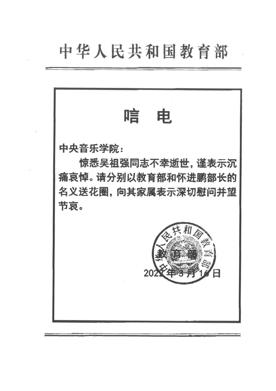中华人民共和国教育部致唁电 悼念吴祖强教授