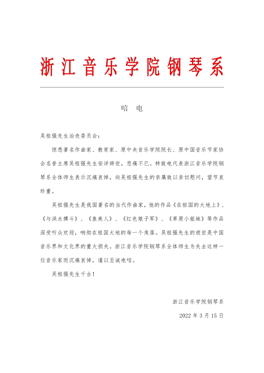 浙江音乐学院钢琴系致唁电 悼念吴祖强教授