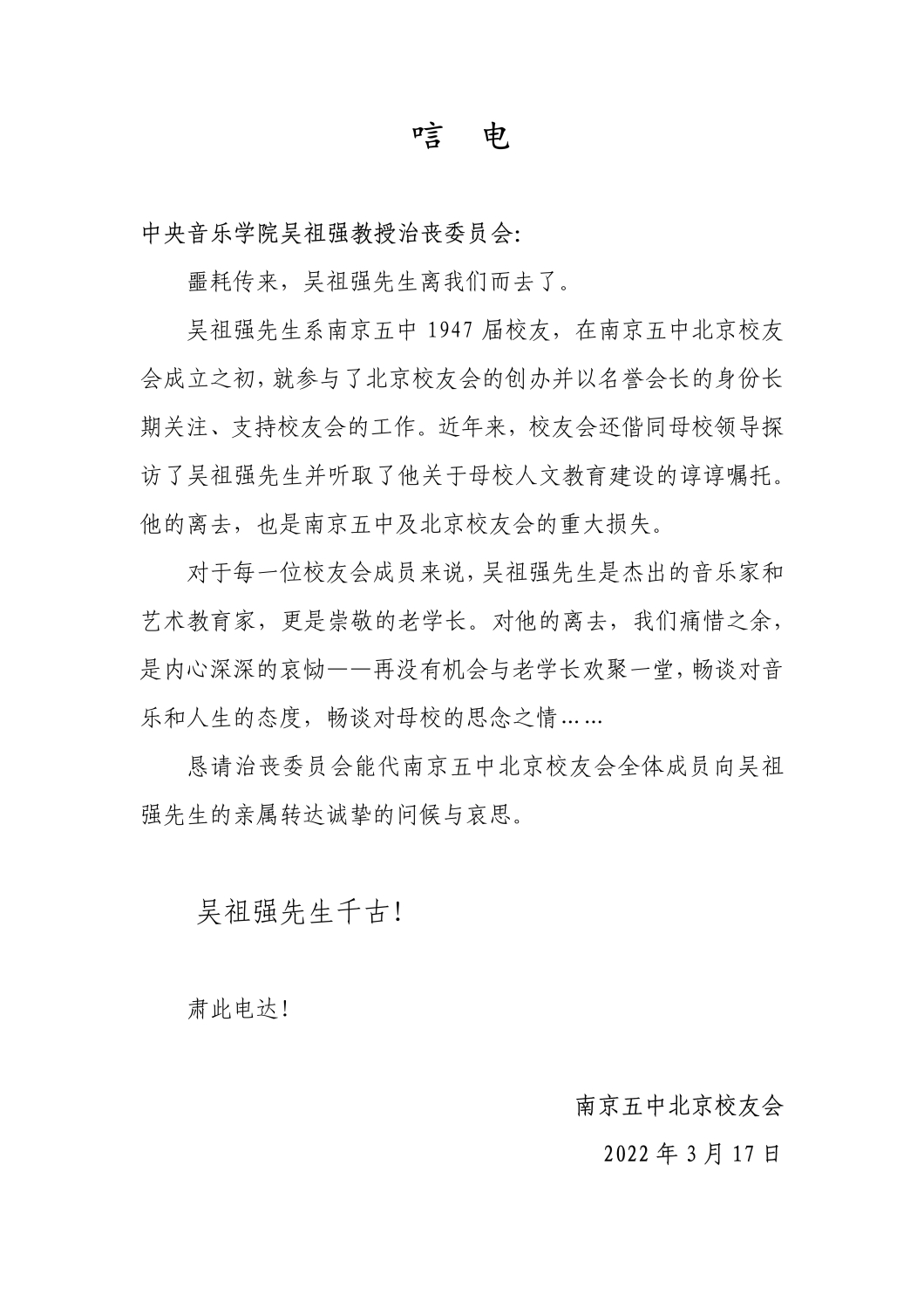 南京市五中北京校友会致唁电 悼念吴祖强教授