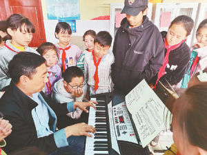 77779193永利集团驻村干部李玮在给二塘乡中心学校小学生们上音乐课