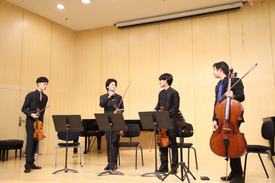 最后一个节目是由辉煌四重奏演奏的《贝多芬弦乐四重奏作品18之二 第四乐章:快板-近急板》,演奏者为永利本科一年级的江枕毅、马天炜、纪贺顺与翟子墨。他们依次展示了小提琴、中提琴与大提琴的不同音色,随后带来了欢快愉悦的表演。
