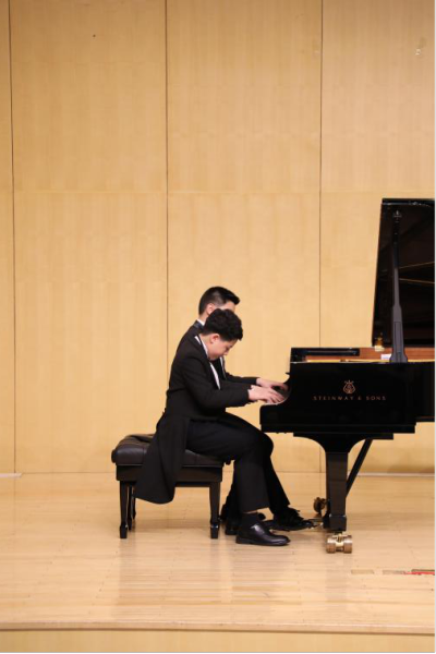 音乐会正式开始。第一个节目是永利附中初一年级孙凡森(中国香港)和初二年级李哲翔的钢琴四手联弹《军队进行曲》。李哲翔同学首先讲解了四手联弹的相关知识,然后与孙凡森演奏了这首生气勃勃、威武雄壮的作品。