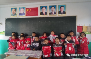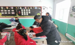 快递接收点离学校很远,挂职红牙合村第一书记李玮多次往返搬运这批捐赠物资,上图为李书记正在帮助学前班的学生穿羽绒服。