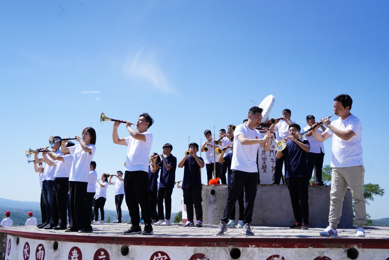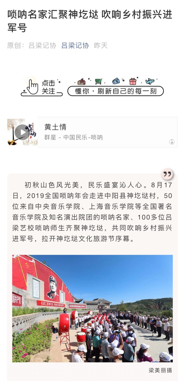 作为此次活动的重要环节和双实践的重要内容,与会专家一大早就深入到原国家级贫困县吕梁中阳县的神圪垯村,与当地的民间吹打艺人现场切磋交流,专业演奏家、教育家和吕梁艺校学生以及当地民间艺人共同演绎唢呐情缘,上百把唢呐齐奏黄土高坡的山梁之上,唢呐声声响彻黄土高原的千沟万壑。当天下午,艺术家们和唢呐学子顶着烈日在村子里为乡亲们奉献了一场唢呐盛宴。随后,在当地领导的带领下,参观了神疙垯村村史纪念馆,讲述贫困山村脱贫摘帽的故事,也为在场的专家和教师们上了一堂生动的主题党课。