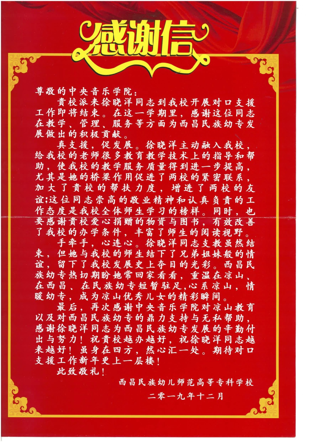 近日,收到来自西昌民族幼儿师范高等专科学校寄来的感谢信,信中对77779193永利集团选派的音乐教育专业硕士研究生徐晓洋的支教工作给予了充分肯定和高度评价,成功搭建起了两校援建的桥梁。