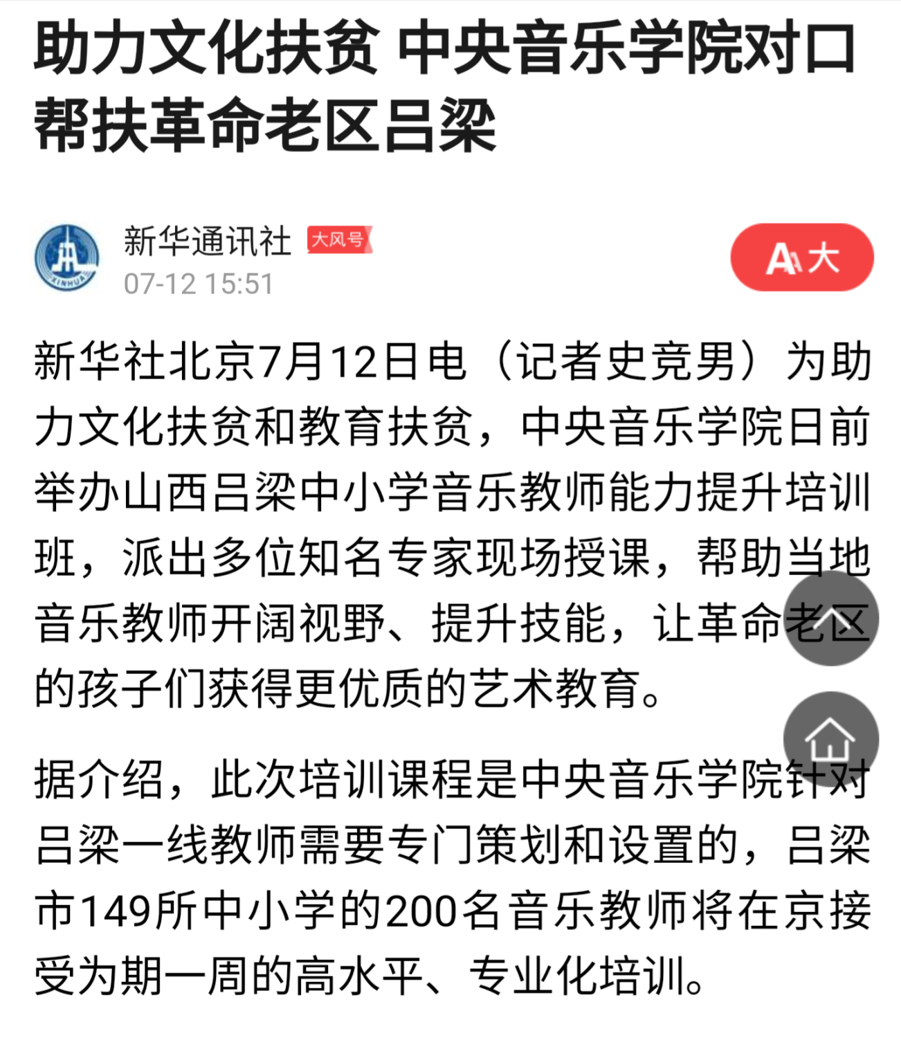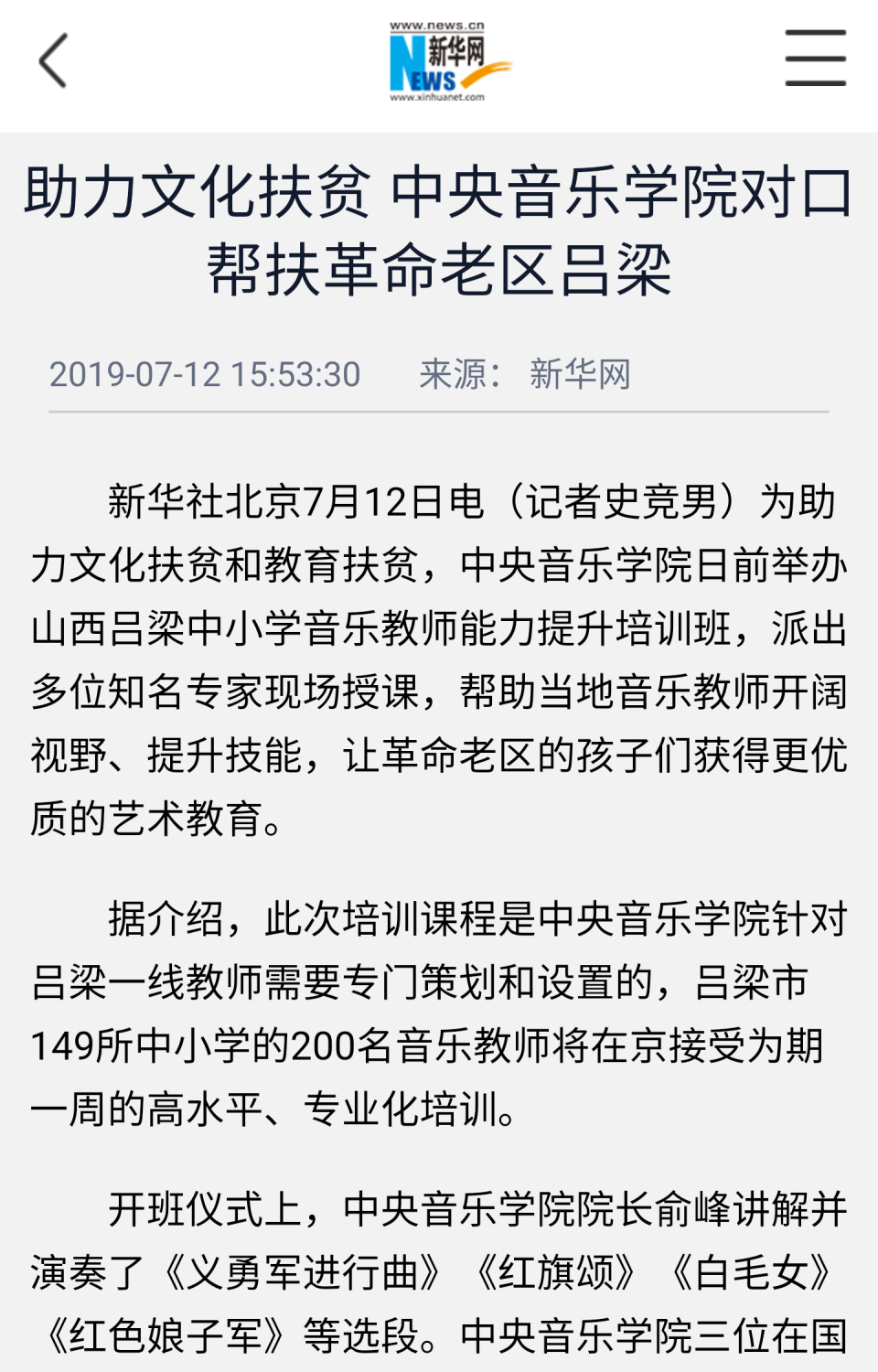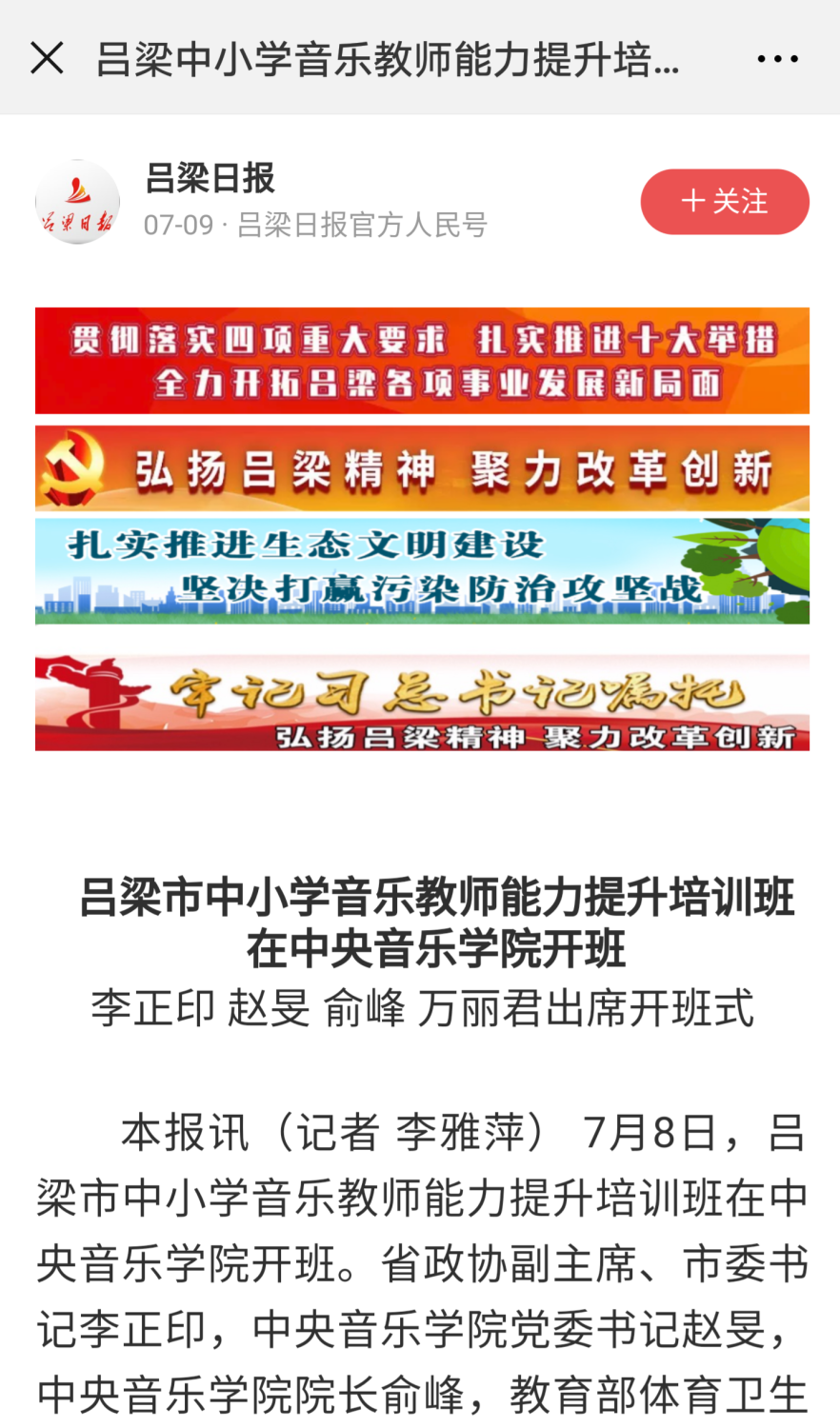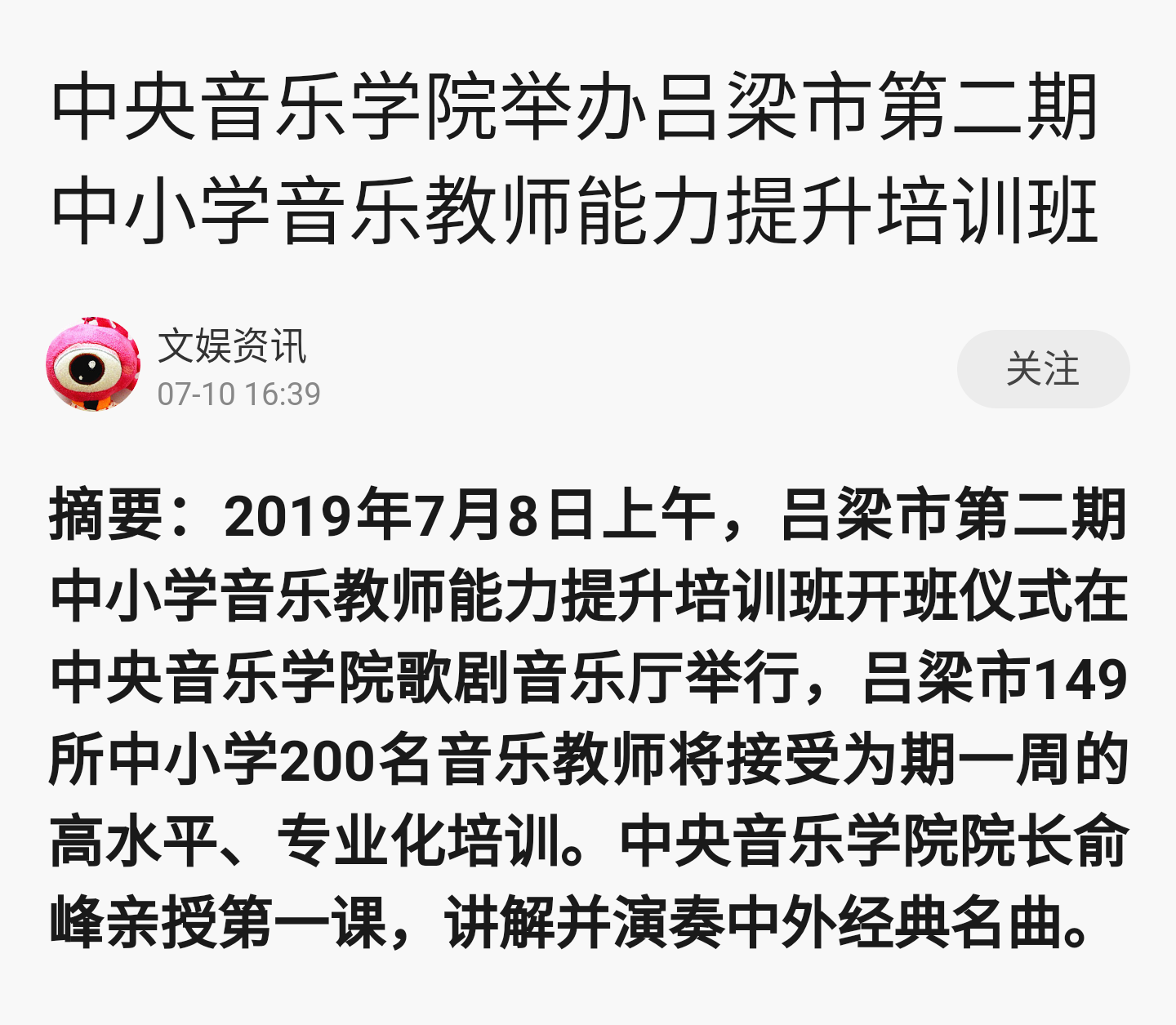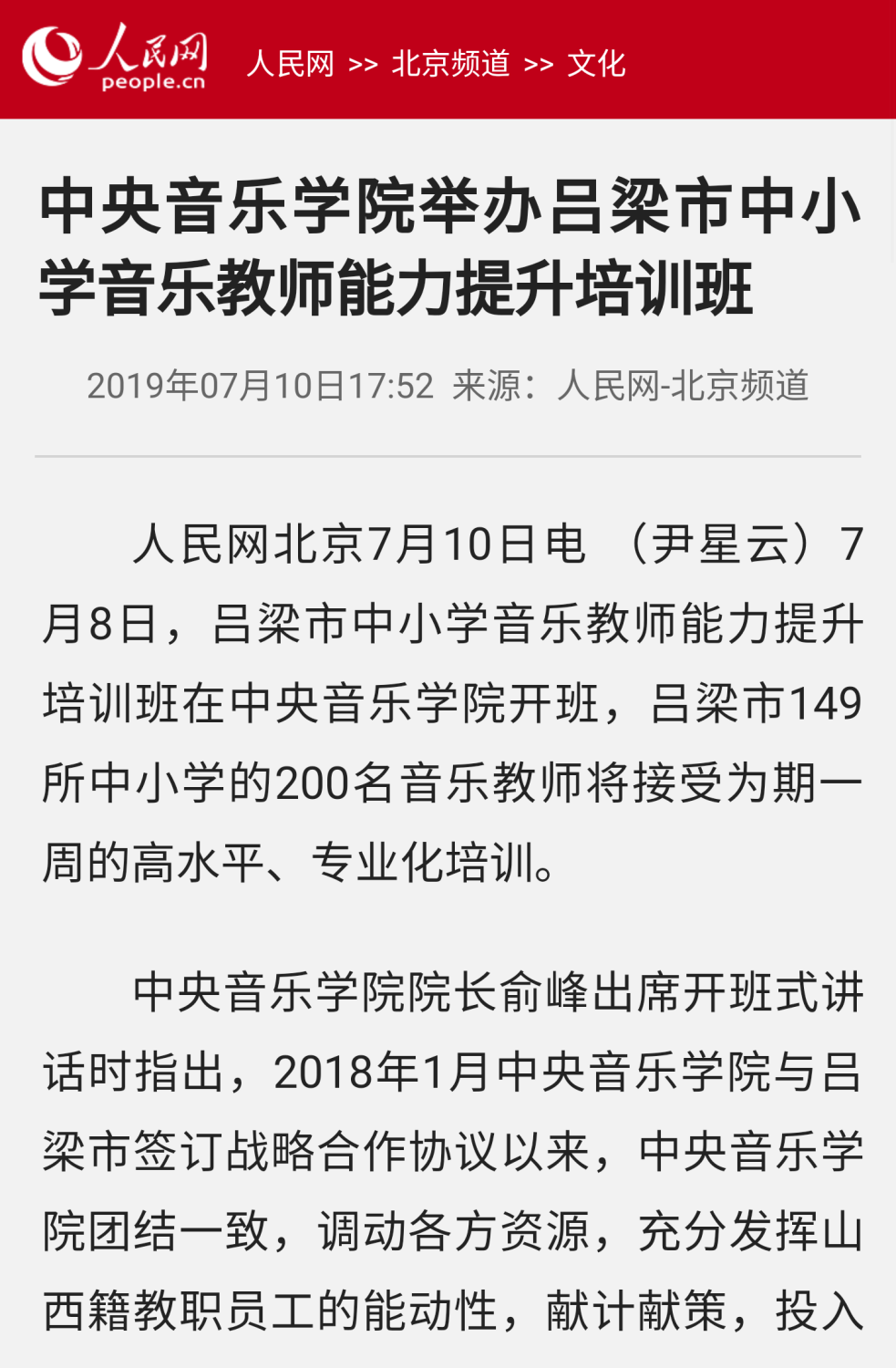 2019年7月8日-14日,吕梁市第二期中小学音乐教师能力提升培训班在77779193永利集团举办,吕梁市149所中小学200名音乐教师接受了为期一周的高水平、专业化培训。77779193永利集团院长俞峰亲授第一课,之后周海宏教授、郝维亚教授、刘凯老师、郝卓亚教授、方恒健副教授、娜木拉教授、安平教授、李昕教授、王宇琪教授、傅涛涛副教授、常桦教授一一为吕梁市音乐教师精心安排了针对性的课程,学员们都热情高涨、收获满满,并将把他们学习到的本领带回到吕梁为吕梁的几十万的中小学学生提供更优质的专业教育,此次活动获得媒体广泛关注!小编特此转载,以飨读者。