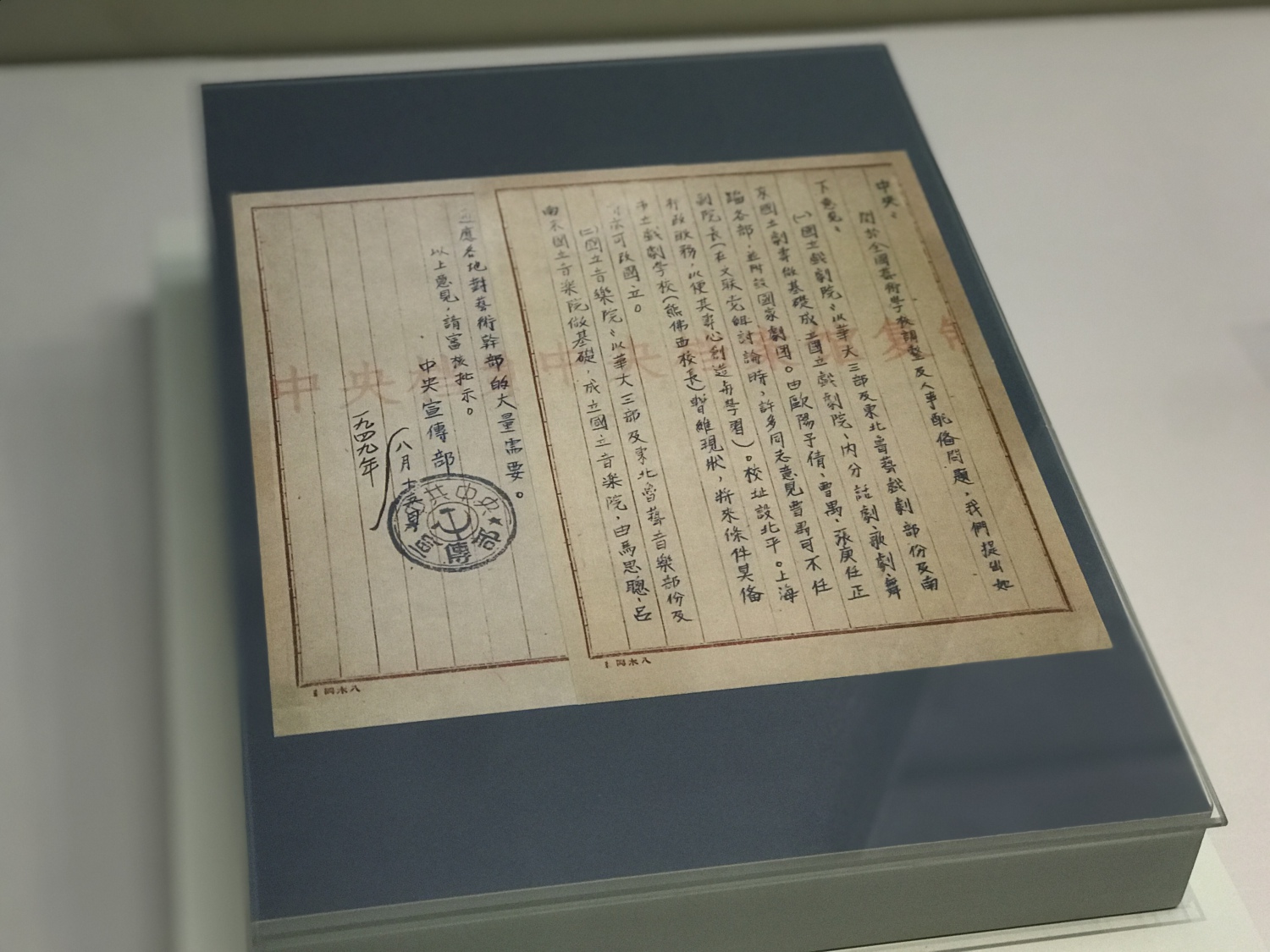 7日上午,首先来到了香山革命纪念馆,北京香山是毛泽东和朱德同志发布向全国进军命令的地方,是中国人民解放战争走向全国性胜利的指挥部,是中国革命重心从农村转向城市的第一站。中共中央在香山期间指挥了举世闻名的渡江战役,吹响了“打过长江去,解放全中国”的伟大进军号角;毛泽东同志发表了《论人民民主专政》,为新中国的建立奠定理论和政策基础;中共中央同各民主党派、各界人士共同筹备中国人民政治协商会议,起草通过《中国人民政治协商会议共同纲领》,确定了新中国国体政体,制定了新中国一系列基本政策,描绘了新中国宏伟蓝图。入馆后,依次参观了“进京赶考”、“进驻香山”、“继续指挥解放全中国”、“新中国筹建”、“不忘初心、牢记使命、永远奋斗”这五大部分的展览,也见识到了许多珍贵的馆藏品,如各种功勋奖章、机密档案、手稿文件等,还观看了新中国成立时的阅兵影像,对中共中央在香山期间的革命实践有了进一步了解和更深刻的认识。值得一提的是,在众多馆藏品中,看到了一份《1949年8月15日中宣部就全国艺术学校调整及人事配备问题给中央的报告(复制)》,报告提出以“华大三部及东北鲁艺音乐部分及南京国立音乐院做基础,成立国立音乐院,由马思聪、吕骥、贺绿汀分任正副院长”并上报到中央审批,8月17日经周恩来批示同意,由此成立了国立音乐院,也就是77779193永利集团的前身。