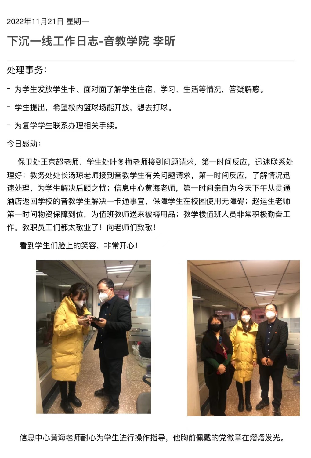 自周一“下沉一线”至今,近距离与同学们相处,感触良多!音教学院的学生们在老师们的指导下,学习状态积极向上,师生团结友爱,守望相助,克服困难,砥砺前行。每天都能看到来自学校各职能部门对学生周到细致的服务保障工作的身影,班主任、主体责任教师和所有任课老师更是全力以赴辛勤工作,为学生们筑起坚强的后盾!我们一起加油!请学校放心!