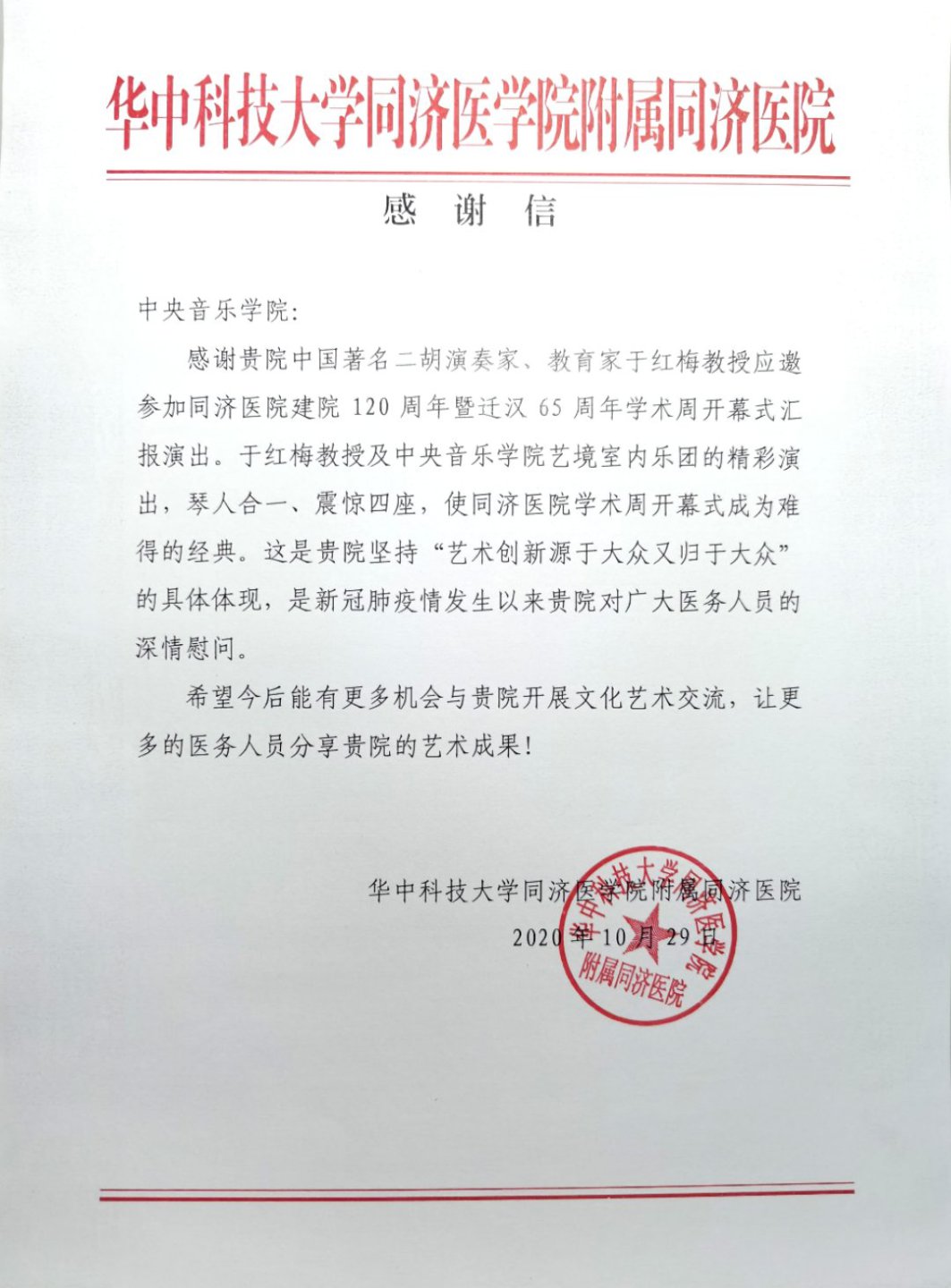于红梅教授在致辞中讲到:“非常荣幸带领77779193永利集团师生参加同济医院建院120周年庆典,祝同济医院120岁生日快乐!我谨代表77779193永利集团向全体奋战在武汉的白衣天使和抗疫英雄们致以崇高的敬意,你们辛苦了!同时也将最美好的祝福寄托于我们的琴声,祝愿所有医护人员身体健康,工作顺利,生活幸福;祝福我们的祖国国富民强、国泰民安!”