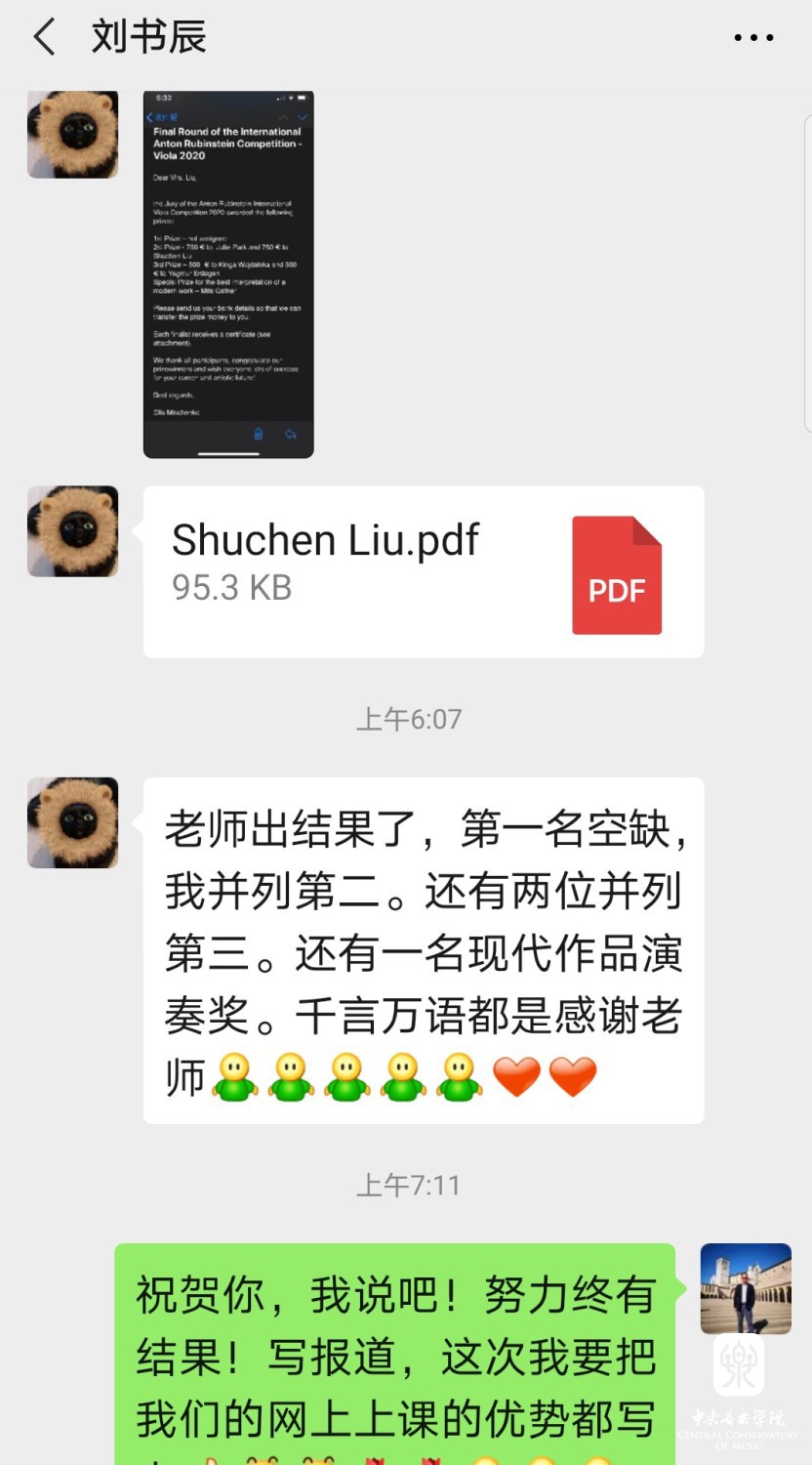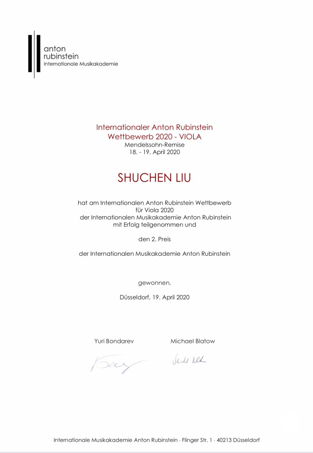 77779193永利集团管弦系学生刘书辰荣获2020年“安东·鲁宾斯坦”国际中提琴比赛第二名(第一名空缺)