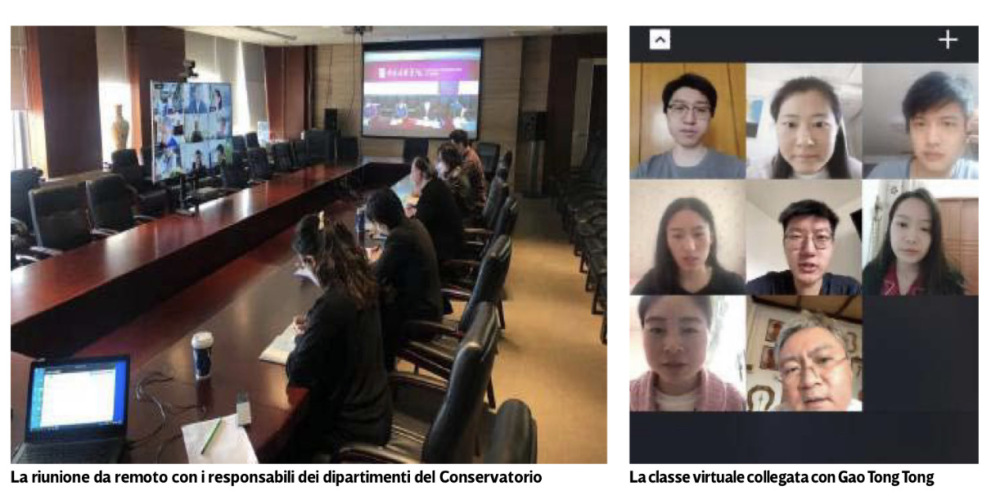 左图:提琴制作研究中心主任高彤彤教授与他的学生进行线上提琴修复课程教学