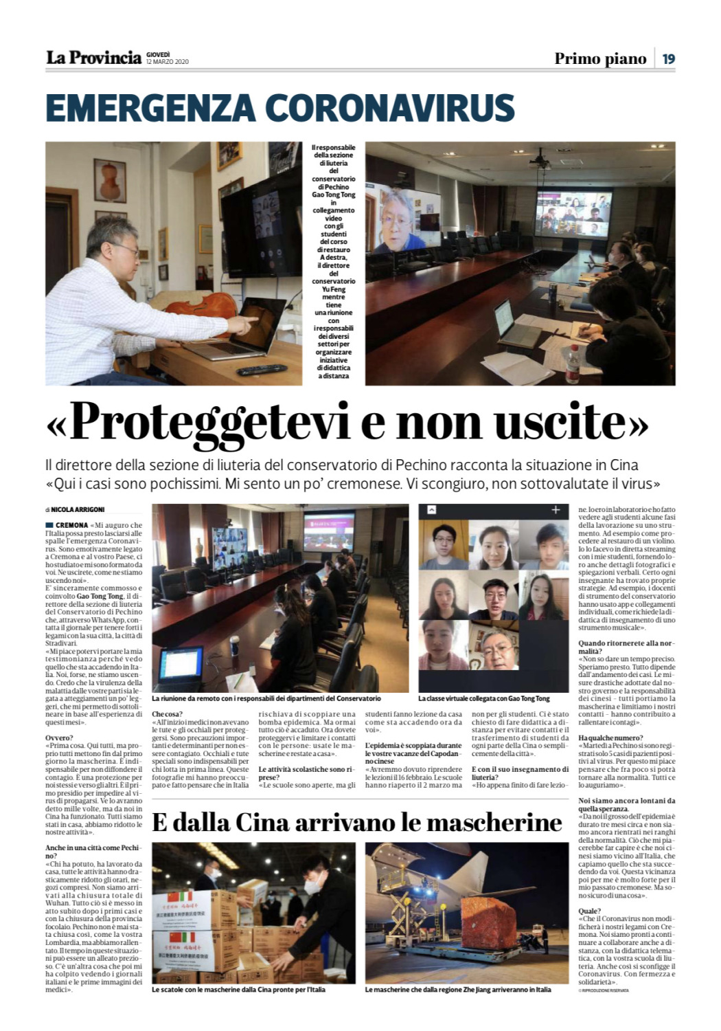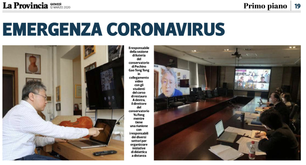 近日,在中国新冠病毒疫情防控形势渐趋平稳的时刻,来自世界疫情重灾区的意大利克雷莫纳当地报纸,连线采访了永利提琴制作研究中心副主任高彤彤教授,并以“保护好自己不要外出”为新闻标题刊登了采访内容,向意大利当地人民介绍了中国先进而有效的抗疫经验。采访中,意大利记者了解了中国目前疫情的发展状况,并询问了高老师本人对意大利当前疫情的看法与建议,同时还特别取经永利“停课不停学”的具体做法。