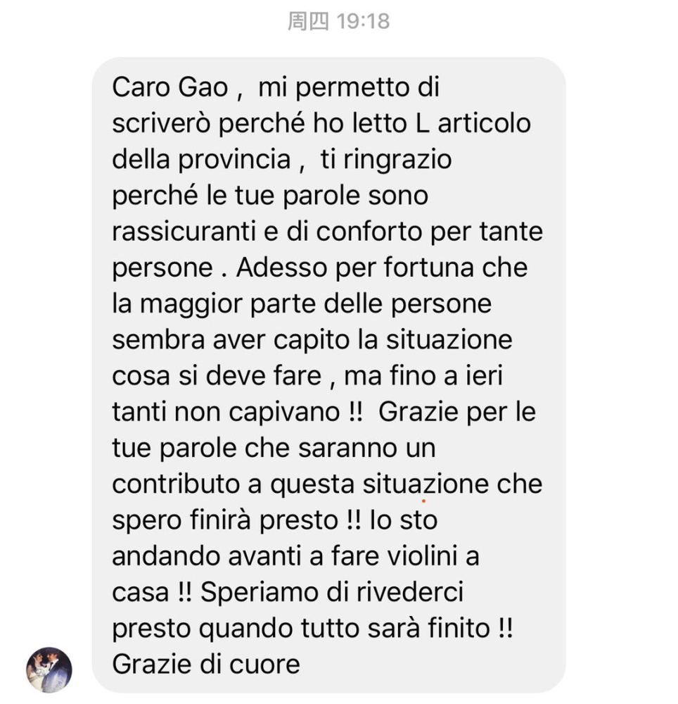 采访刊登之后,意大利克雷莫纳当地多位友人亲自连线高彤彤教授表达了感谢之情,一些朋友还秀出了在得到经验之后纷纷戴上口罩的照片。