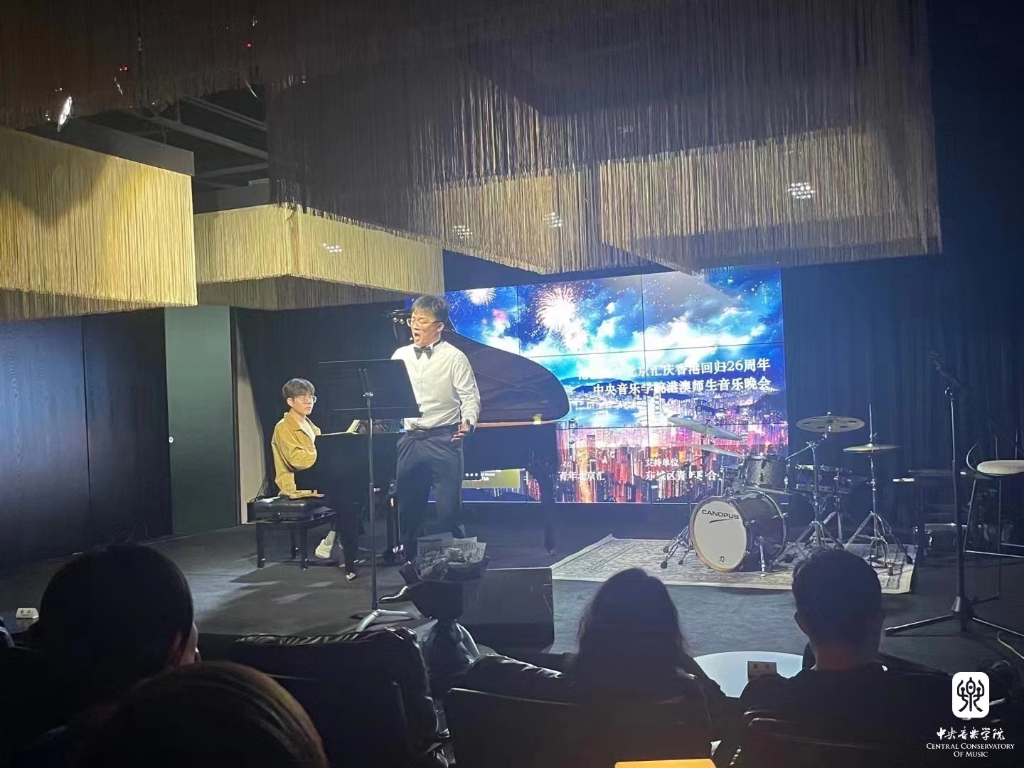 在观众进场、中场休息和观众退场的时段,打击乐专业的研究生燕嘉熠同学和作曲专业的研究生吴天戈同学为现场的观众献上了精彩的即兴演奏,为晚会增添了轻松愉悦的气氛。