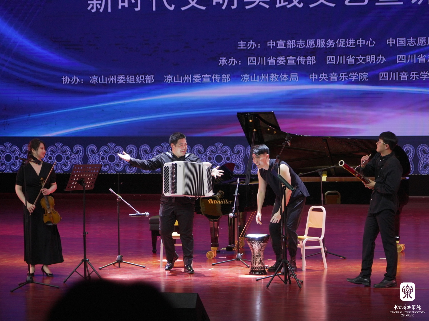 经过长途跋涉,文艺志愿服务队走进了凉山州喜德县中坝社区广场、凉山州普格县螺髻山镇大槽乡广场,通过手风琴、打击乐、古筝、笛子、声乐等多种形式,为当地近千名少数民族同胞群众精心策划了精彩的文艺宣讲。选取喜闻乐见的经典红色音乐作品,用演奏和宣讲的形式,面对面与大家亲切互动,以娓娓道来的故事分享,让群众们在音乐中了解党的声音,在满足精神文化需求的同时,将党的温暖带到他们身边,用文艺传递党的关怀和温暖,用文艺助力乡村振兴,用文艺促进各民族心相通、情相融,铸牢中华民族共同体意识。